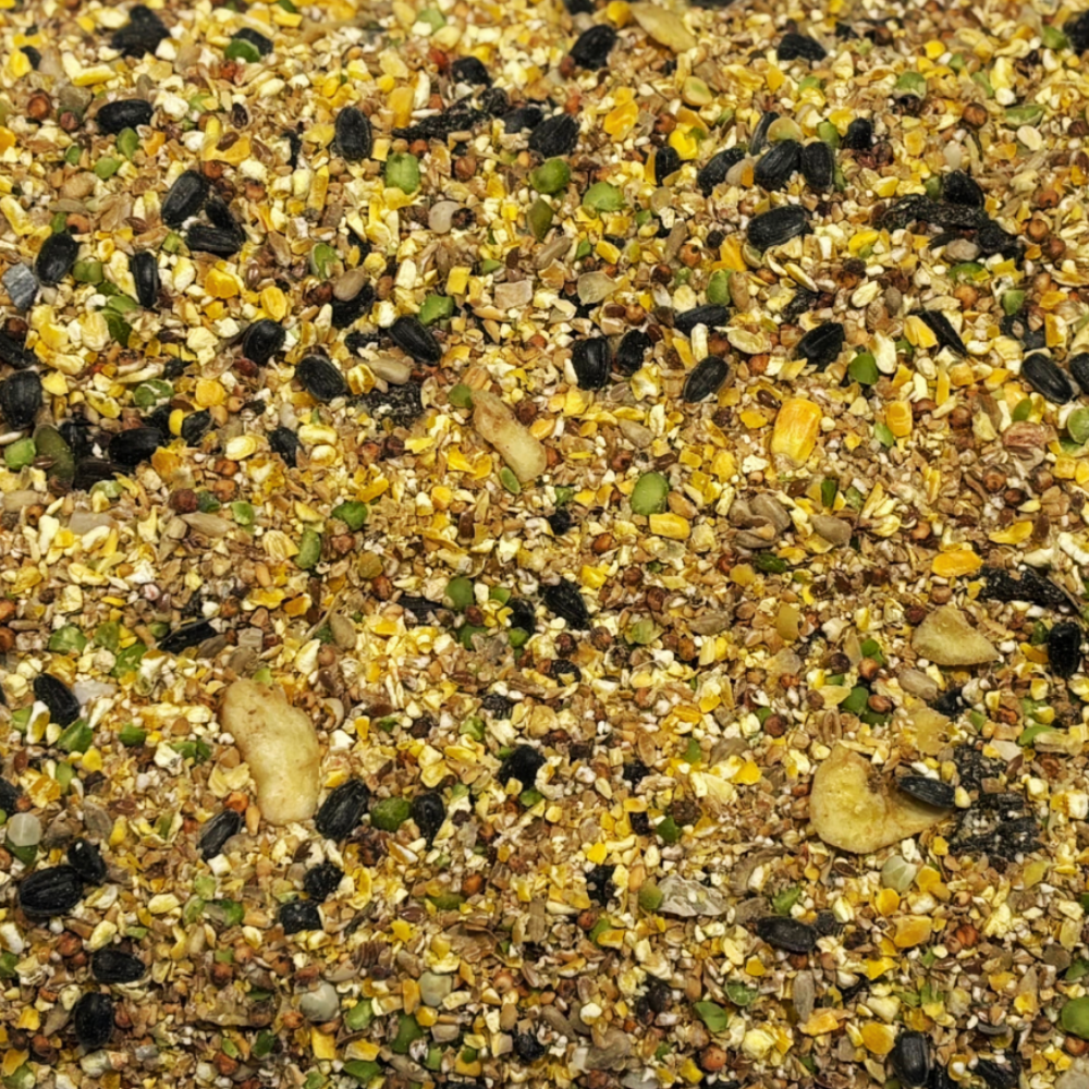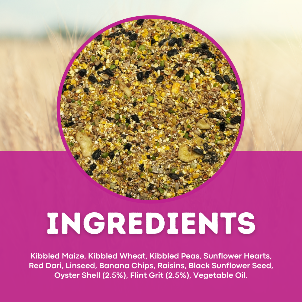 Kibbled Maize. Kibbled Wheat, Kibbled Peas, Sunflower Hearts, Red Dari, Linseed, Banana Chips, Raisins, Black Sunflower Seed, Oyster Shell, Flint Grit & Vegetable Oil