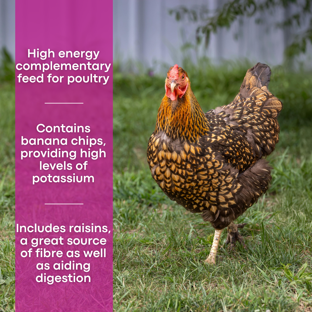 Henergy Contains Banana chips which provides your poultry with a high level of potassium, helping to support muscle and nerve functions.