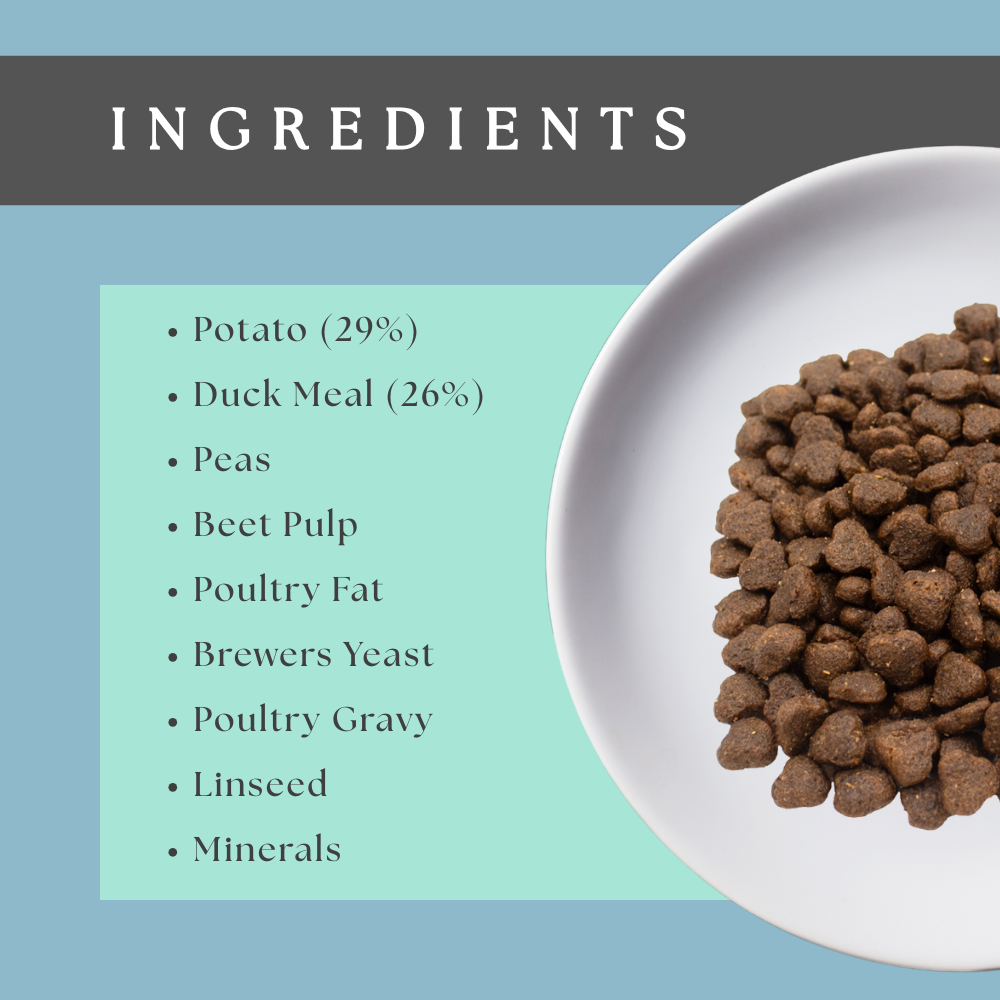 Composition: Potato (29%), Duck Meal (26%), Peas, Beet Pulp, Poultry Fat, Brewers Yeast, Poultry Gravy, Linseed, Minerals