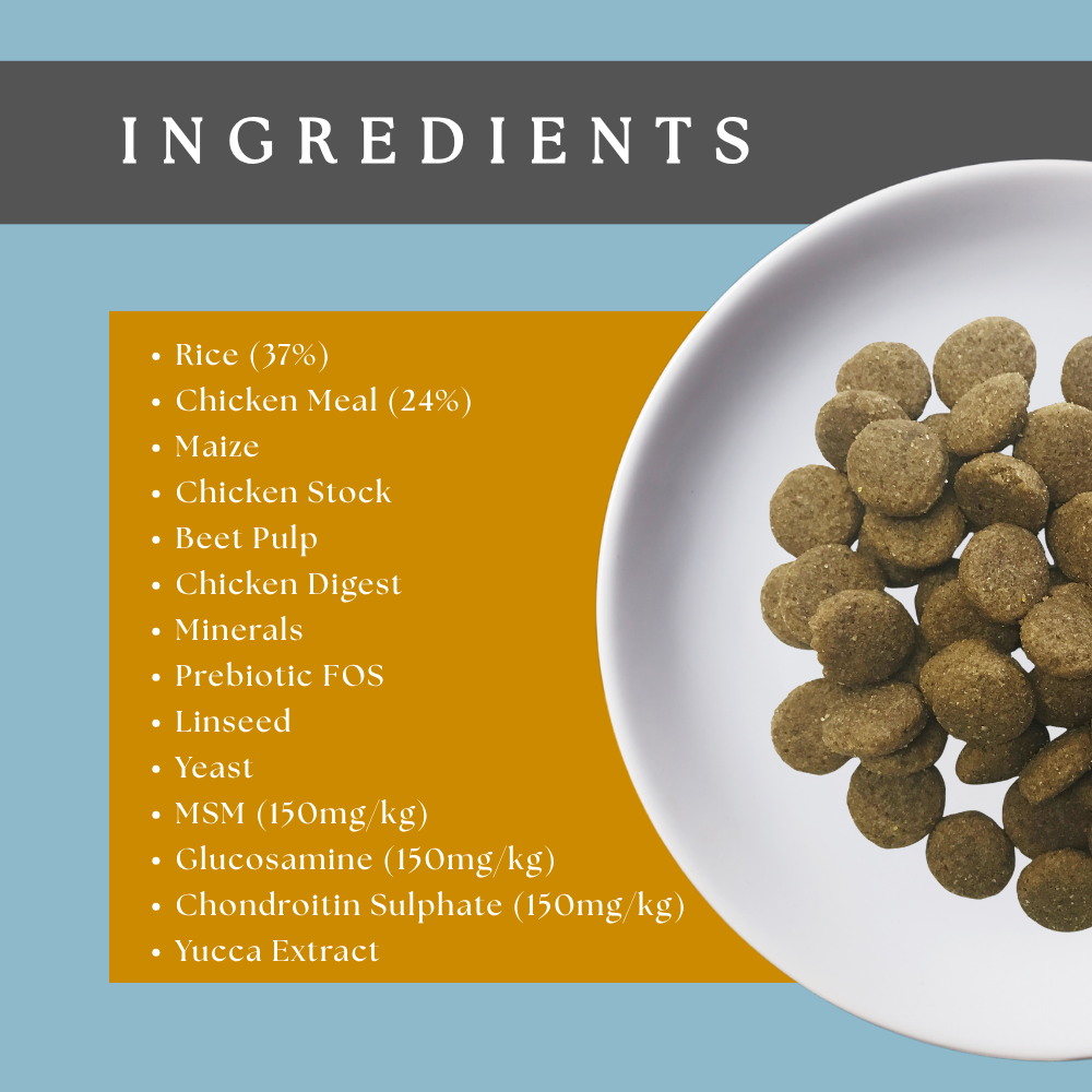 Composition: Rice (37%), Chicken Meal (24%), Maize, Chicken Stock, Beet Pulp, Chicken Digest, Minerals, Prebiotic FOS, Linseed, Yeast, MSM (150mg/kg), Glucosamine (150mg/kg), Chondroitin Sulphate (150mg/kg), Yucca Extract.