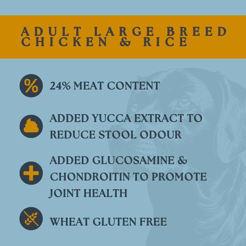 This kibble is highly digestible, palatable and hypoallergenic. Specially formulated without wheat and wheat gluten to provide a complete hypoallergenic diet. Containing a full complement of vitamins and minerals with the addition of omega-3 and 6 fatty acids, zinc and biotin to promote a healthy skin and coat. It will also promote joint mobility and repair because it contains glucosamine, MSM and chondrotin sulphate. It is specifically formulated to provide the correct ratio of protein to fat to ensure ideal growth and maintenance nutrition for your large breed dog. No artificial colours, flavours or preservatives. With added yucca to reduce stool odour.