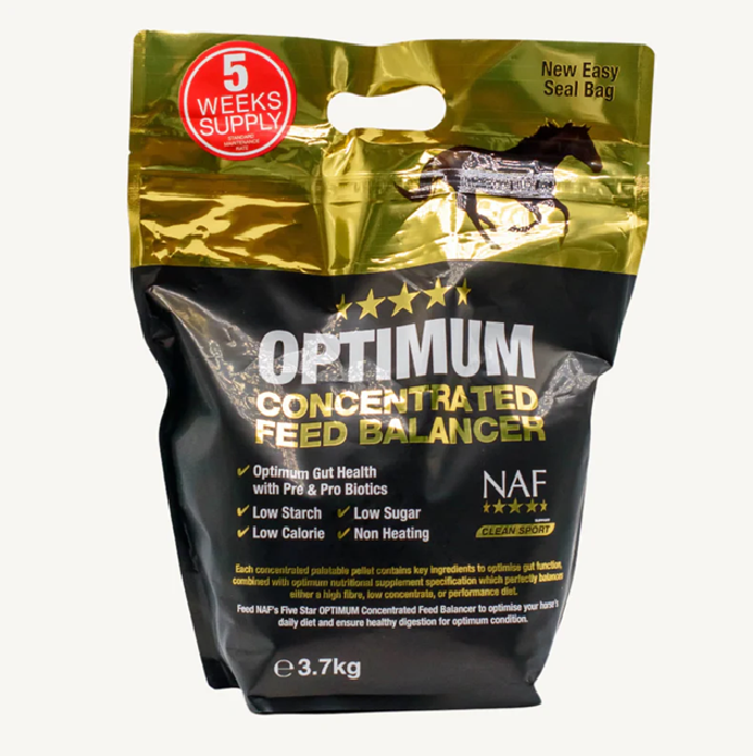 Feeding NAF’s Five Star OPTIMUM Concentrated Feed Balancer will optimise every horse’s daily diet, and the great news is the unique concentrated formula is perfect for every horse, from family pony to performance athlete, making it the optimum choice for all. Concentrated and easy to feed, OPTIMUM comes in a palatable pellet, each with optimal supplement specification and a great flavour. OPTIMUM is formulated to complement either a high fibre, low concentrate or performance diet and optimise the nutritional value of every daily feed ration. When a daily feed is not necessary, OPTIMUM can be simply given on its own. Each concentrated palatable pellet contains key ingredients to optimise gut function, combined with optimum nutritional supplement specification which perfectly balances either a high fibre, low concentrate, or performance diet. Feed NAF’s Five Star OPTIMUM Concentrated Feed Balancer to optimise your horse’s daily diet and ensure healthy digestion for optimum condition.